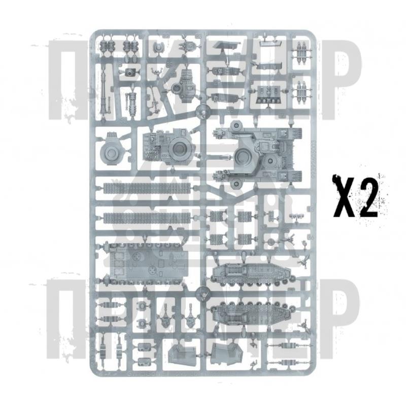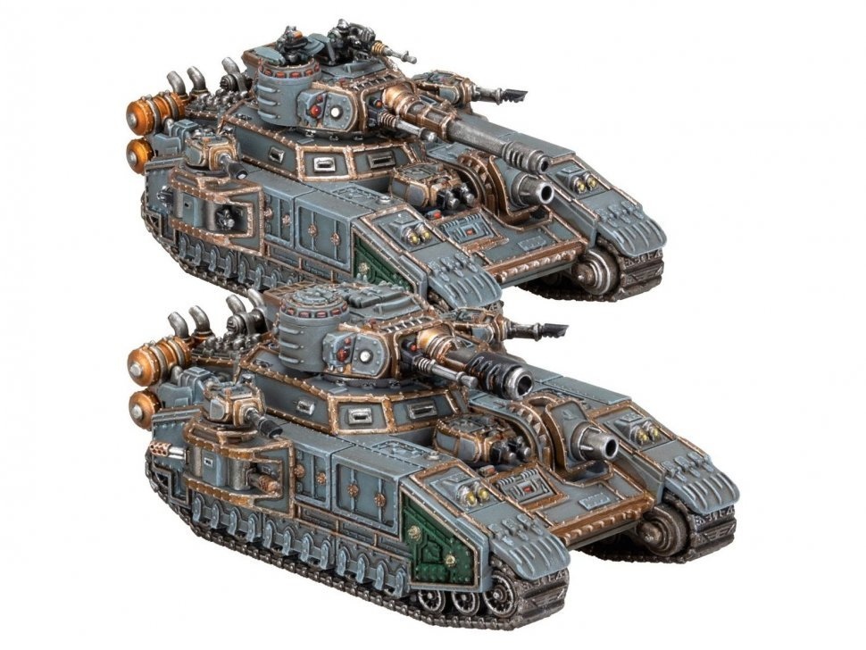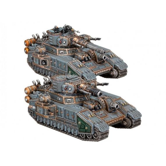 Из этого многокомпонентного пластикового набора можно собрать два сверхтяжелых танка Солярной Ауксилии эпического масштаба. Каждая из этих массивных машин обладает сокрушительной огневой мощью и может быть оснащена турельным вооружением на выбор: боевой пушкой «Baneblade» для уничтожения целей на расстоянии или пушкой «Hellhammer» для борьбы с бункерами и тяжелой броней, а также спаренной автопушкой. У них также есть выбор спонсонного оружия — спаренные автопушки, тяжелые болтеры или тяжелые огнеметы. Помимо этих вариантов вооружения, оба танка оснащены установленной на корпусе пушкой «Demolisher» и тяжелым болтером, а также спаренными спонсонами лазпушек. В комплект входят косметические варианты сборки башен каждого танка, позволяющие персонализировать машины с помощью наводчиков, корректировщиков, различными вариантами люков, и тому подобного.