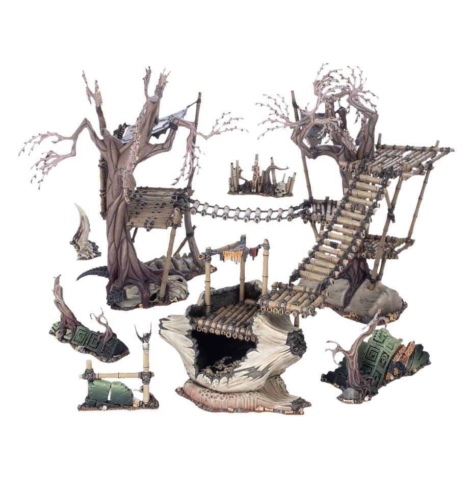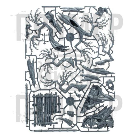 Декорации из Гнарлвуда – 10 элементов пластикового ландшафта, полностью совместимых с существующими наборами декораций из Гнарлвуда, включая 1x Убежище в лощине, 2x Гнарлоаки, 2x веревочные мосты и 5x препятствия, такие как разрушенные руины, частоколы, кости и сломанные столбы
