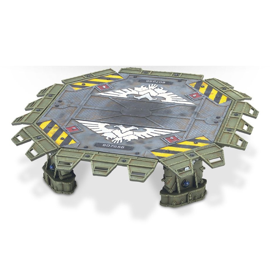 Посадочные площадки - это стартовые базы, используемые летательными аппаратами для выгрузки или эвакуации войск и жизненно важного персонала. Взлетно-посадочная площадка "Скайшилд", используемая имперским флотом, изначально была построена специально для размещения боевых кораблей "Валькирия", но она достаточно надежна, чтобы обслуживать даже "Громовые ястребы" Адептус Астартес, и оснащена генераторами поля, которые защищают корабль и его экипаж от встречного огня.