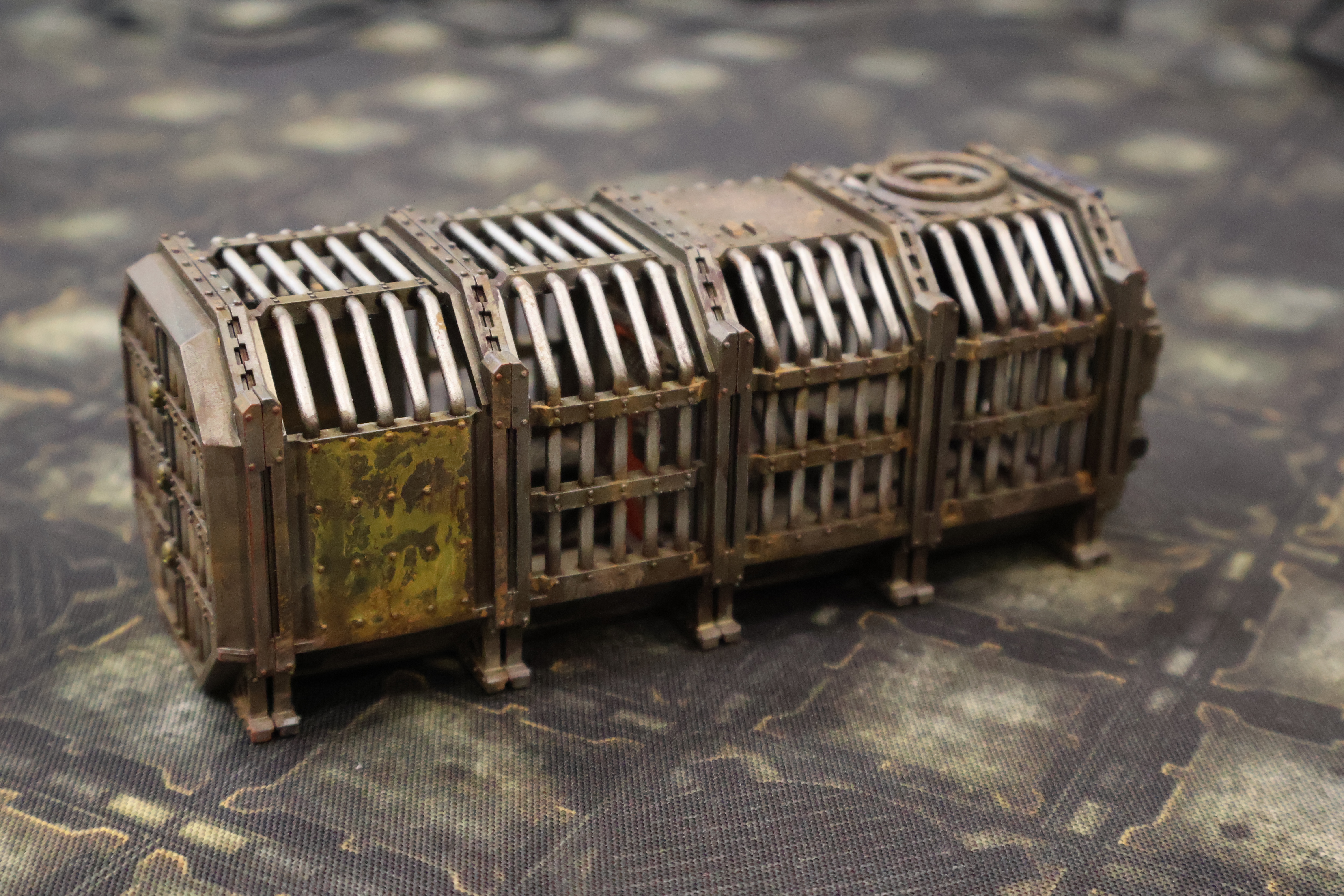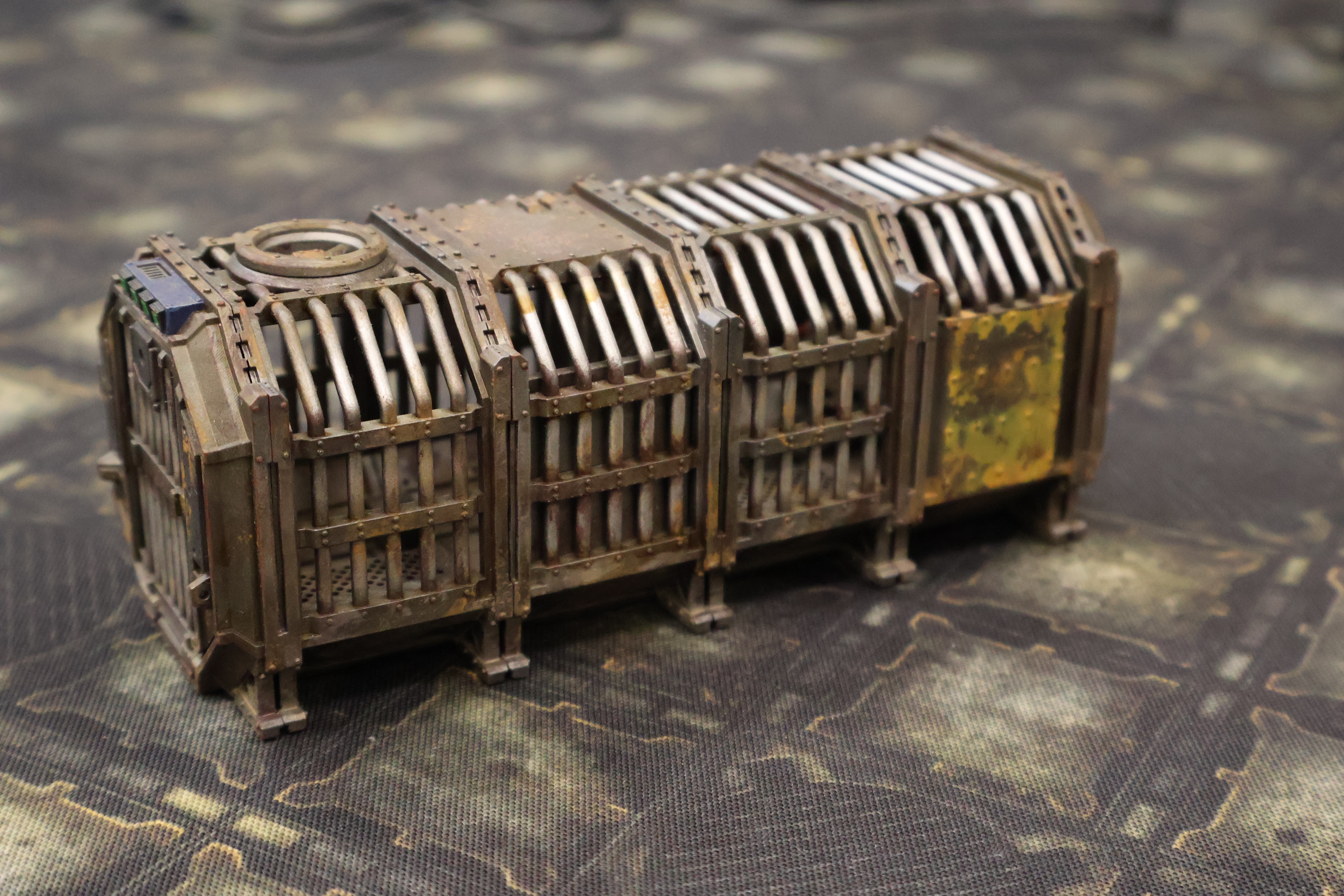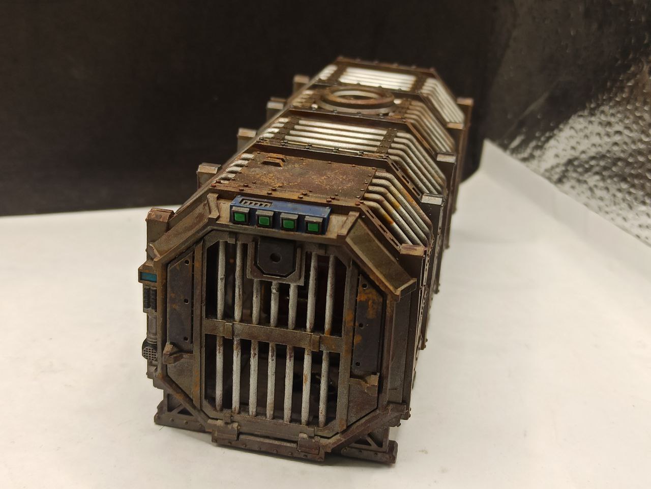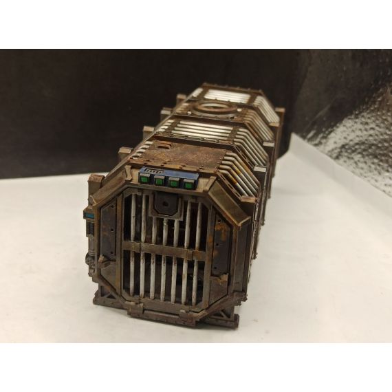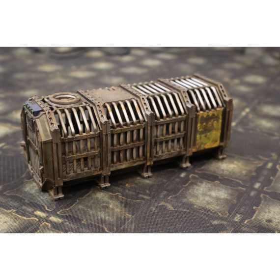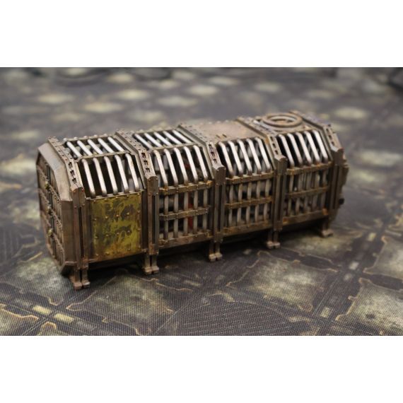 Длина 150мм высота 60 мм Ширина 60 мм. Разборный контейнер Тюрьма. Имеются слоты под магниты . В наборе 4 части одного контейнера съёмные двери и внутренние аксессуары. Отлично подходит для Necromunda. Продается не крашеный .