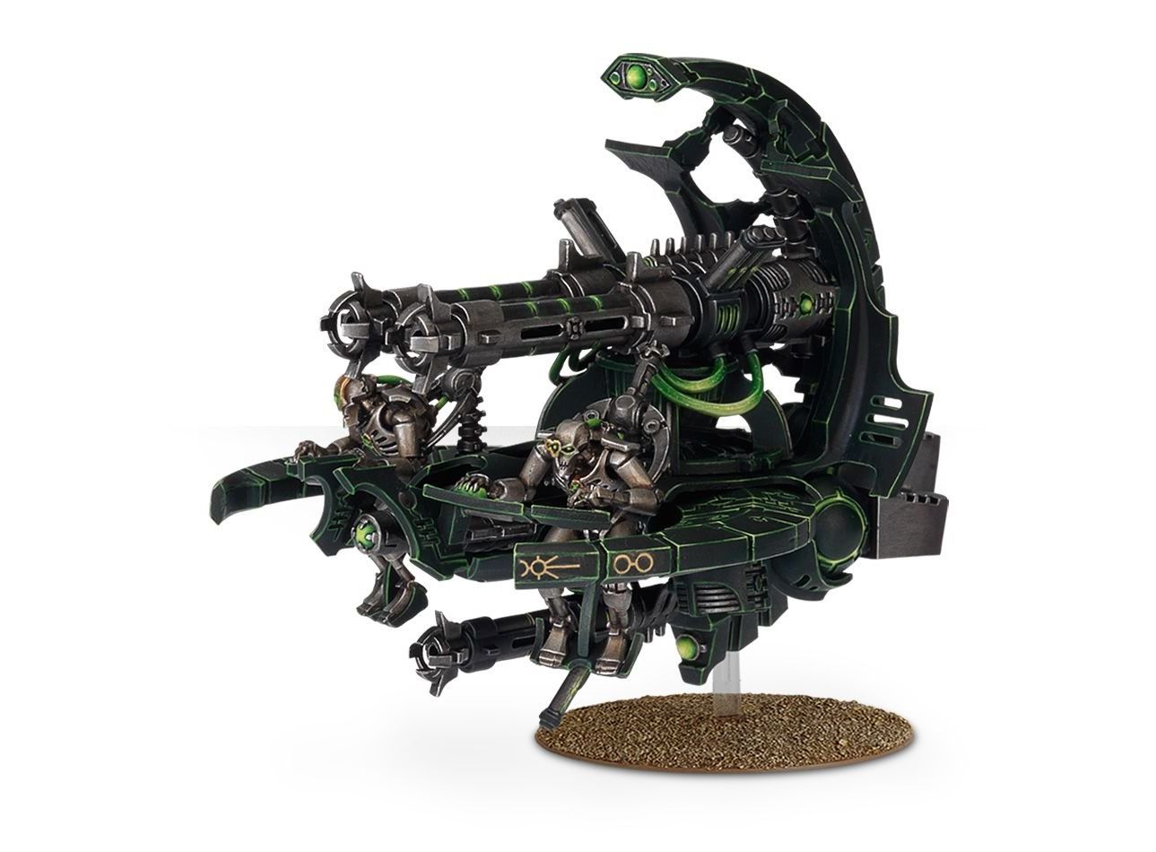 На поле боя Некронов можно часто встретить Command Barge, в котором восседает Necron Overlord и наблюдает за ходом боя, следя за войсками и за тем, чтобы сражение шло по плану. Эта машина украшена династическими символами и станет отличным дополнением к любой коллекции Некронов. Скелетообразный Лорд Некронов гордо стоит за железной трибуной, указывая вперед своей косой. По бокам ниже располагаются два приспешника Некрона, сидящие за приборными панелями.