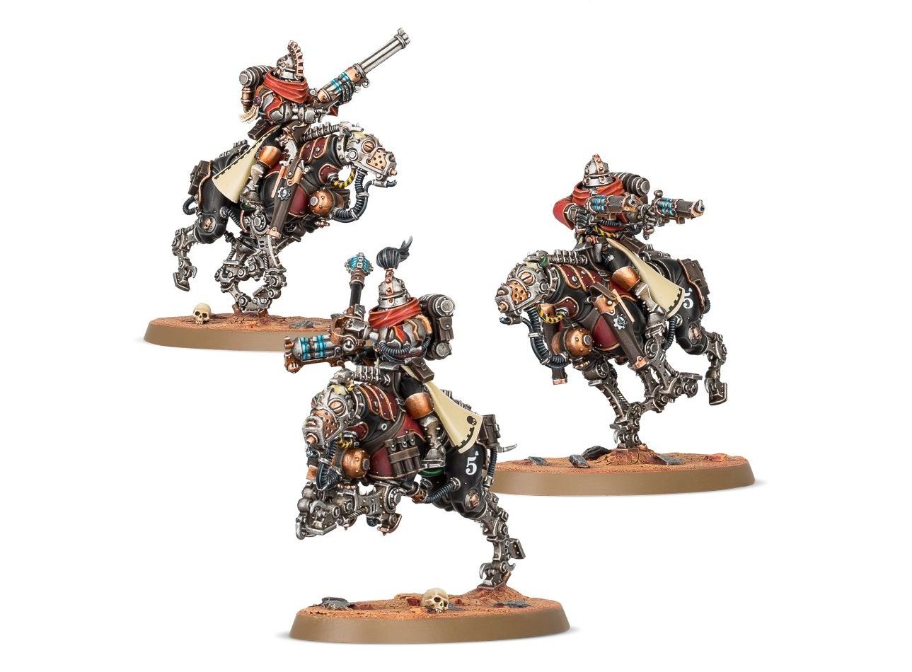Наездники Церберус имеют первоклассный набор вооружения для ведения боевых действий на любой дистанции, включая гальванические карабины (galvanic carbines), позволяющие вести дальний огонь, а также изысканные кавалерийские шпаги (cavalry sabres) для ближнего боя. Альфа отряда (squad’s alpha) также вооружён крупнокалиберным архео-револьвером (archeo-revolver). Это подразделение – универсальная боевая единица авангарда, способная действовать впереди других отрядов Скитариев и даже атаковать из укрытия вражеские командные позиции.