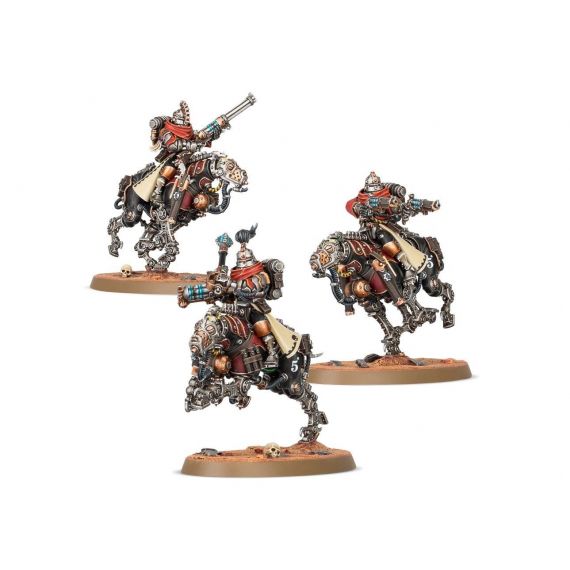 Повышение от манипулы Скитариев (Skitarii maniples) до корпуса Церберус (Serberys corps) – великая честь. Они управляют быстрыми четвероногими созданиями, чьи заострённые конечности позволяют с лёгкостью преодолевать даже самые непроходимые элементы ландшафта, а сами наездники крепко держатся в седле за счёт магнитных гиро-стабилизаторов. Наездники Церберус (Serberys Raiders) – превосходные разведчики, отправляющиеся в самые удалённые локации. Они идеально подходят для захода во фланг вражеских армий и уничтожения незащищённых боевых единиц. Усовершенствованные окулярные модули, имплантированные в черепа наездников, ноосферически связаны с их скакунами, что обеспечивает максимальную точность, в то время как превосходно откалиброванные обонятельные сенсоры и специальная система предугадывания превращают их в по-настоящему устрашающих охотников.