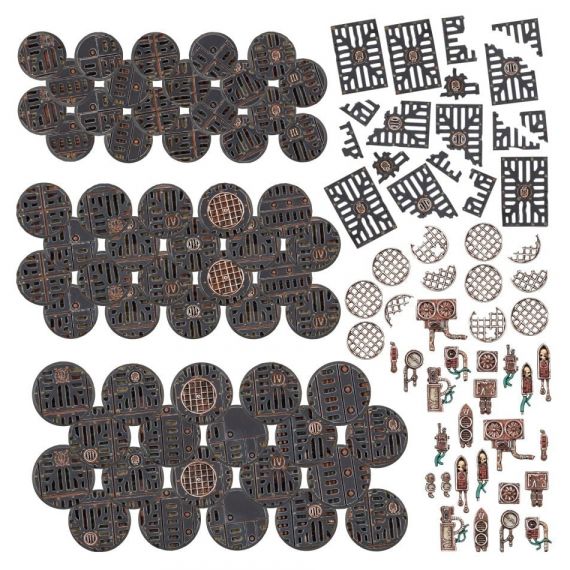 В дополнение к основаниям, этот набор содержит множество мрачных и индустриальных материалов для придания деталей и повествовательных элементов вашим миниатюрам, таких как портальные секции, сломанные панели решетки радиатора, выброшенные вентиляторы, разбитые датчики и изношенные временем вокс-реле.